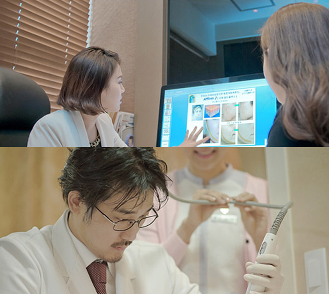 Үйлчлүүлэгчидтэй ганцаарчилсан зөвлөгөөн дээр үндэслэн Mark View (4 хэмжээст арьс хэмжих төхөөрөмж) болон томруулдаг шилээр авсан арьсны гэрэл зургуудаар дамжуулан илүү нарийвчлалтай зөвлөгөө өгдөг. 22 жилийн арвин эмнэлзүйн туршлага дээр үндэслэн бид хүн бүрийн арьсанд тохирсон лазер болон эмчилгээний тоог санал болгож байна. Үйлчлүүлэгчийн авах эмчилгээ, лазер болон түүний үр нөлөөний талаар илүү дэлгэрэнгүй, найрсаг мэдээллээр хангах болно.